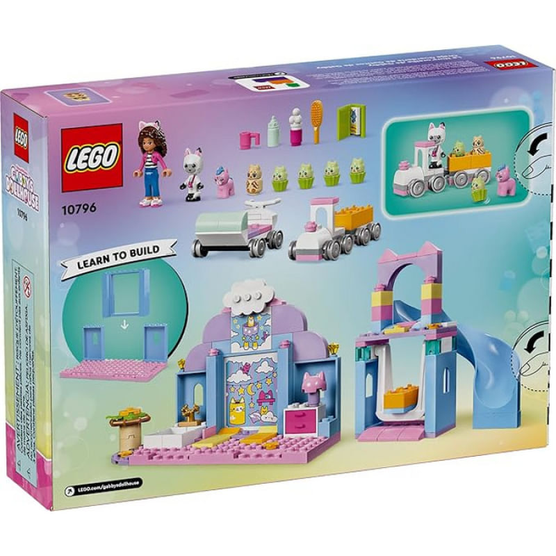 Ideal como presente para pequenos que amam brincar de cuidar de animais, o berçário inclui uma miniboneca da Gabby e figuras de Pandy, Bebê Gatocórnio, Bebê Miauruja e quatro adoráveis Bebês Cupcakes. O cenário traz diversos elementos interativos, como um balanço, escorregador, trem de brinquedo e um carrinho de bebê com quatro assentos em formato de forma de cupcake.