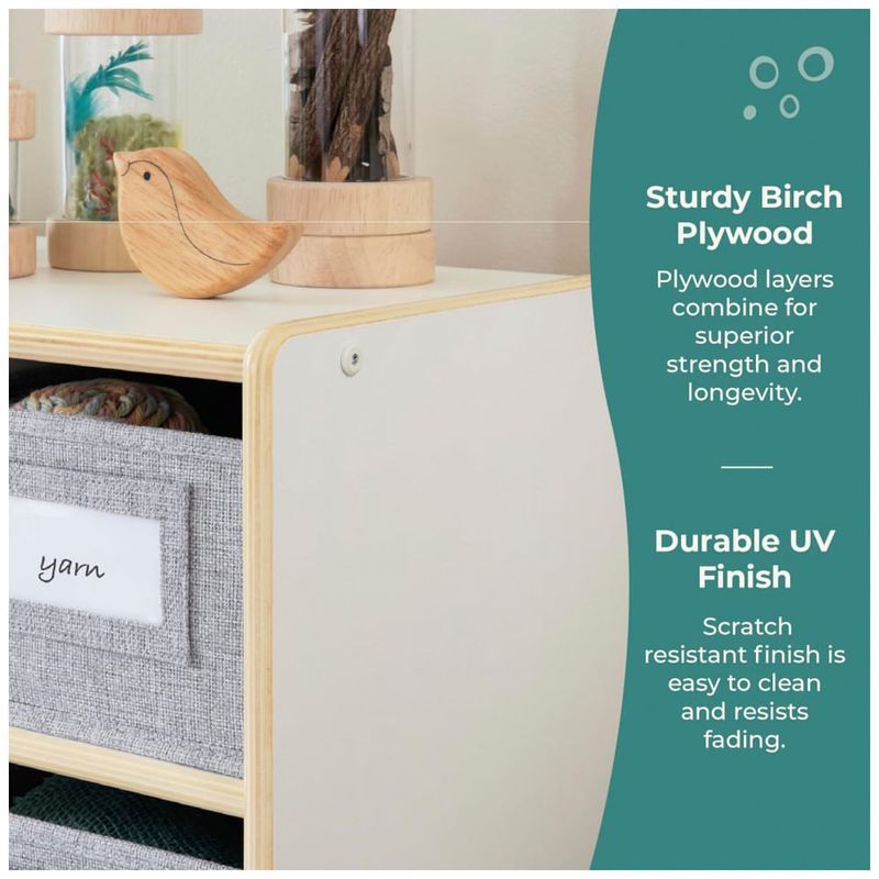 A estrutura é produzida em compensado de bétula com acabamento branco laminado de fácil limpeza e bordas arredondadas, indicada para uso intenso em ambientes com crianças. O painel traseiro fechado garante que os objetos não caiam para trás e possibilita encostar o organizador na parede ou usá-lo como módulo em composições maiores de armazenamento.?