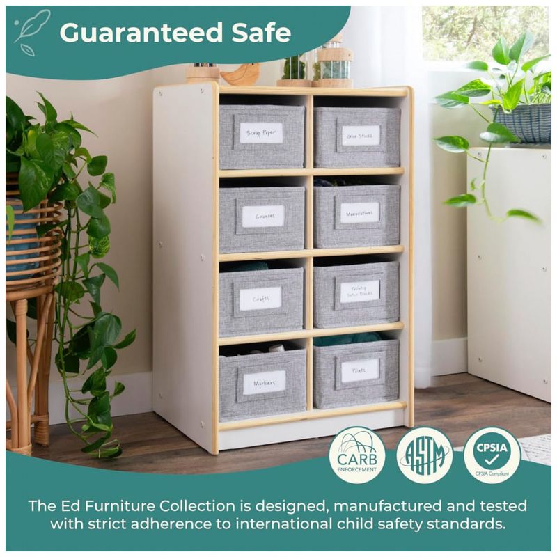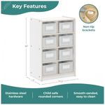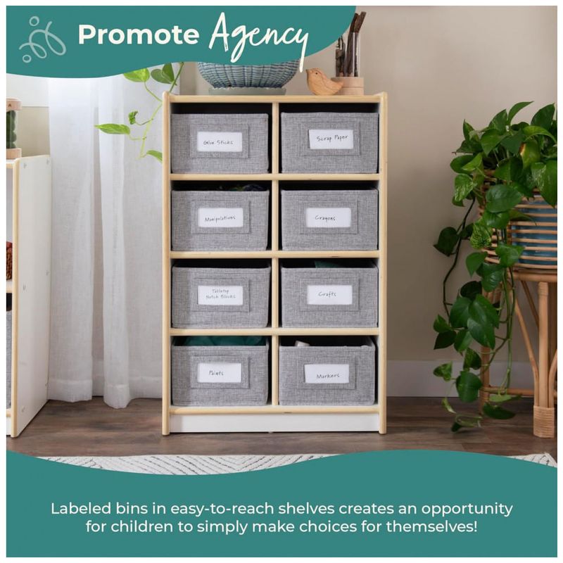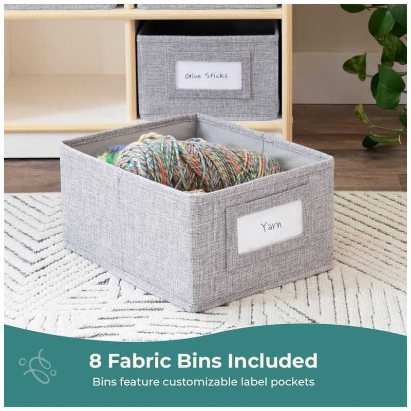 O organizador acompanha oito caixas de tecido resistentes, dimensionadas para encaixar nos nichos, cada uma medindo aproximadamente 20,8cm de largura, 27,2cm de profundidade e 13,5cm de altura. As caixas ajudam a manter peças menores agrupadas e fora de vista, ao mesmo tempo em que permanecem acessíveis para as crianças retirarem e guardarem seus itens com autonomia.?