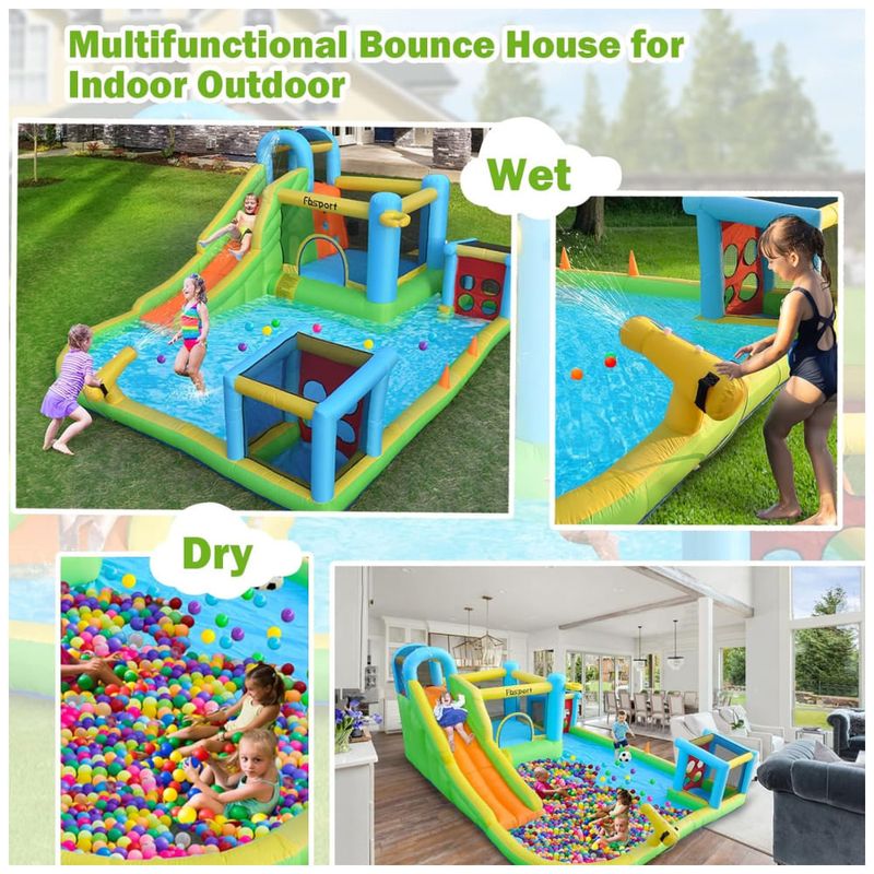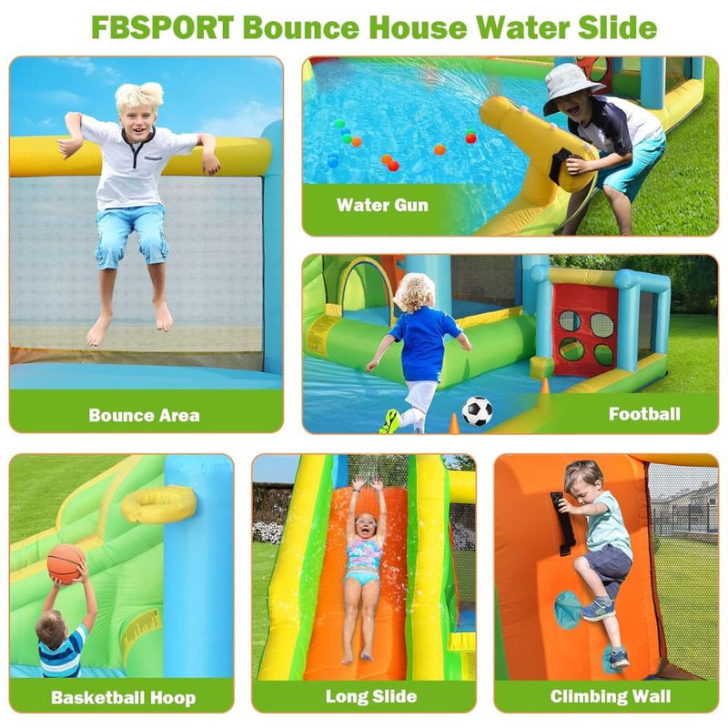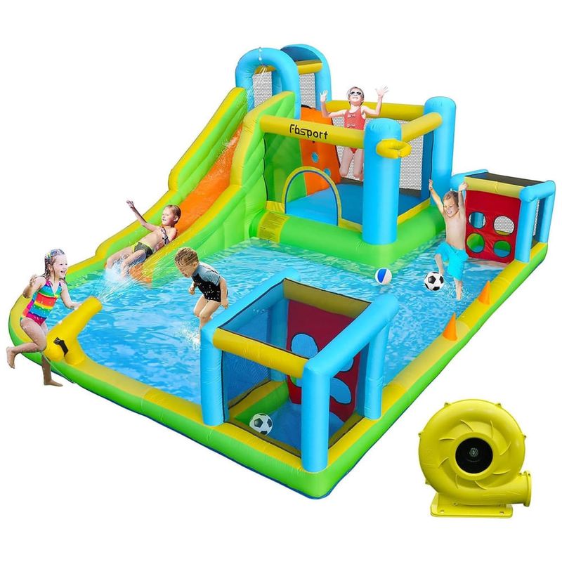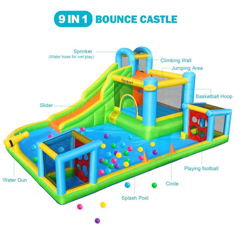 O tobogã inflável 9 em 1 é a escolha perfeita para quem busca diversão e projetos para as crianças. Combinando escorregador longo, enorme piscina infantil, dois gols de futebol, área de salto, canhão de água, parede de escalada, cesta de basquete, círculo e mangueira de água, este produto é garantia de muitas horas de entretenimento.