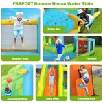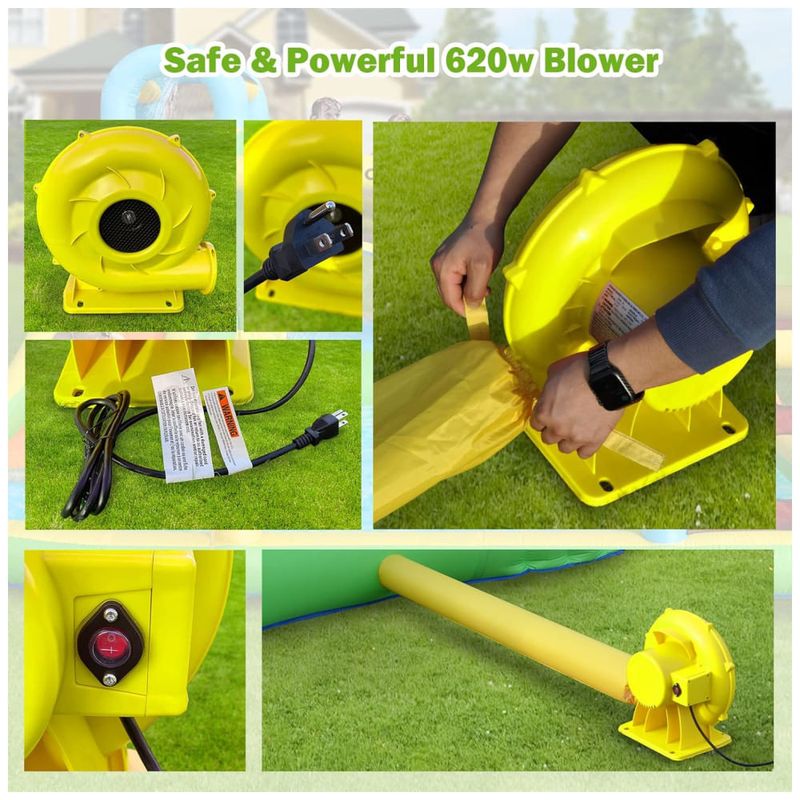 O conjunto inclui um soprador de ar elétrico de 550 W, 6 estacas de segurança, 10 remendos de reparo, 4 estacas de soprador, 1 mangueira de água e 1 bolsa de transporte para fácil armazenamento e transporte. Com o escorregador aquático, você pode proporcionar diversão extra para seus filhos, sendo perfeito para festas infantis e reuniões familiares.