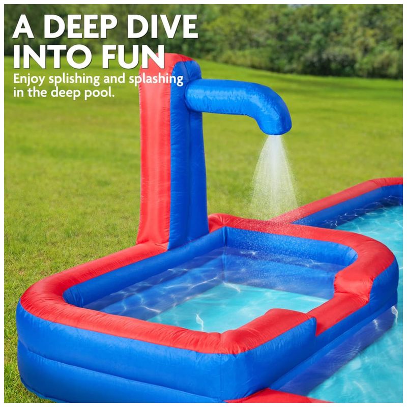O Parque de Toboágua Inflável Mega Climb N Go é um playset saltitante ideal para recreação de entretenimento em casa. Com uma lista inflada de recursos, ele proporciona horas de diversão ao ar livre e molhada. Possui três recursos divertidos que incluem uma parede de escalada, dois toboáguas Splash Down Deep Pool que fornecem uma variedade de atividades aquáticas e mantém várias crianças entretidas ao mesmo tempo.