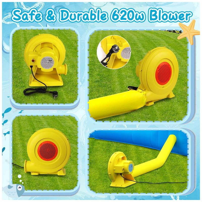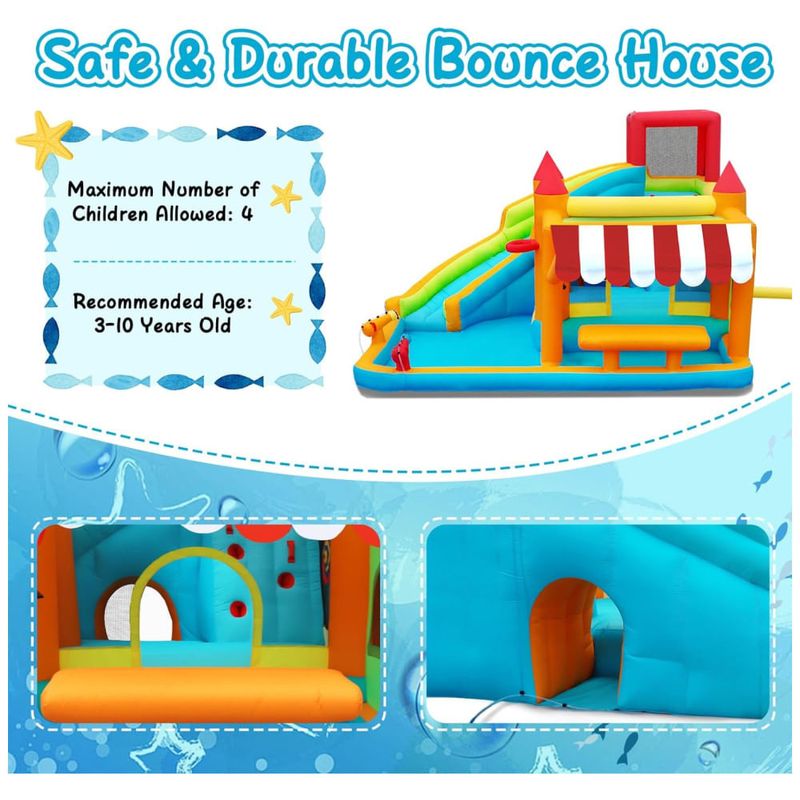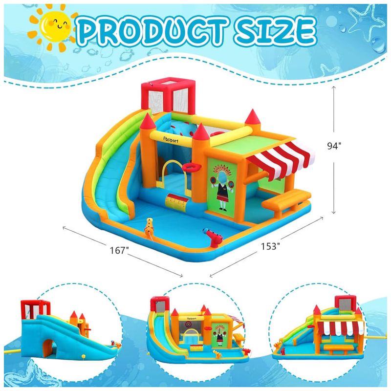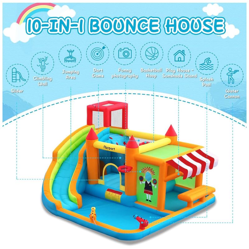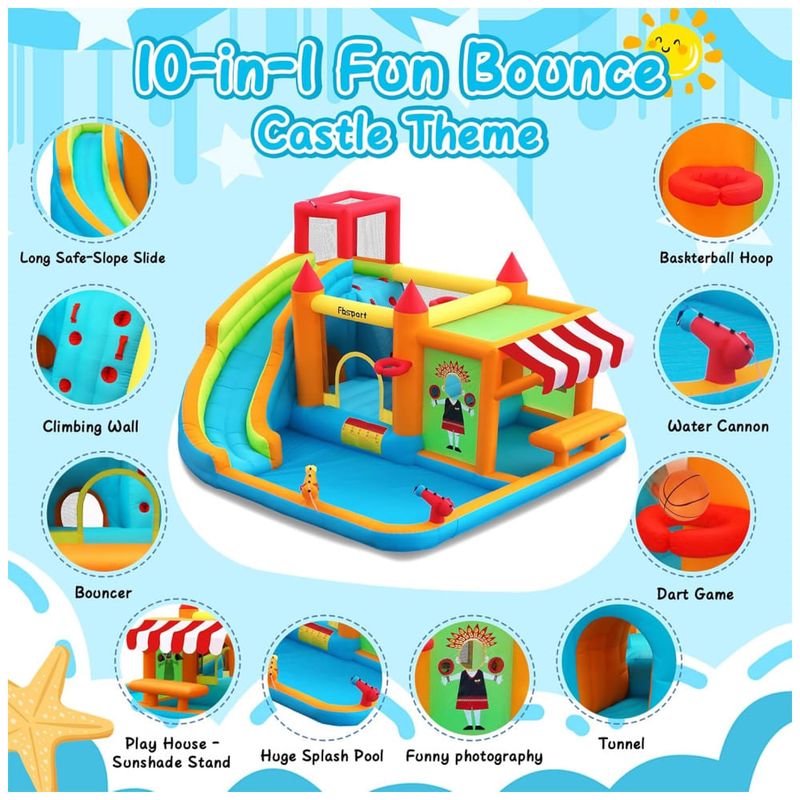 A Casa Inflável de Pula-Pula com Tobogã Aquático 10 em 1 da FBSPORT é o sonho de toda criança! Com tobogã, piscina de respingos, área de pulo, duas pistolas d'água, parede de escalada, dois aros de basquete, aspersores, túnel, área de fotografia divertida, jogos de arremesso e um quiosque com sombra para brincadeiras imaginativas. Feita com materiais de alta qualidade e design seguro, esta casa inflável proporciona anos de diversão segura. Pode ser usada tanto molhada quanto seca, perfeita para festas de aniversário e atividades ao ar livre. Acompanha um soprador elétrico de alta qualidade para inflar rapidamente. Tudo o que você precisa em um só pacote!