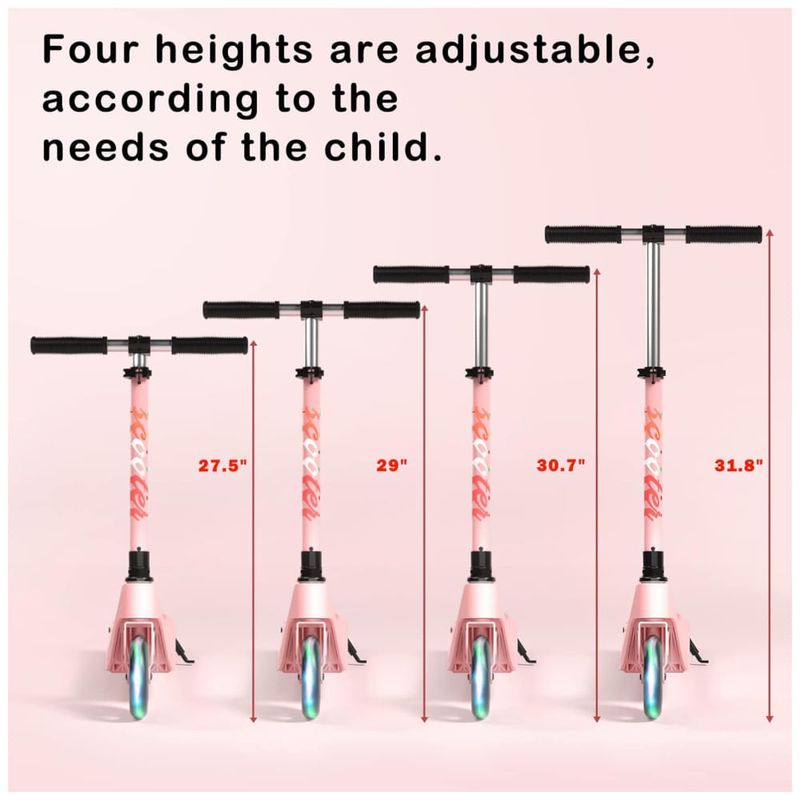 A scooter infantil foi projetada com guidão ajustável e 4 opções de altura ajustável, permitindo que as crianças encontrem a altura de pilotagem perfeita. É indicada para crianças de 6 a 10 anos e é equipada com rodas dianteiras iluminadas em PU e luzes LED nos pedais, tornando a divertida e altamente visível.
