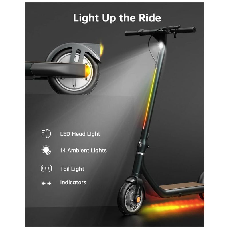 DESIGN ELEGANTE, PASSEIO MAIS SUAVE Corpo elétrico de scooter de alumínio de grau aeronáutico leve e robusto, visor LCD exclusivo, sistema de suspensão traseira oculto, pneus sem câmara de ar confortáveis e 14 modos coloridos de luzes ambientais garantem a robustez elegante e resistente.