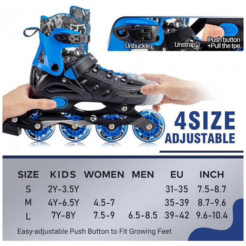 TAMANHO AJUSTÁVEL: Verifique nossa tabela de tamanhos na imagem do produto para garantir a escolha do par correto. Com um simples botão de ajuste facilita e torna conveniente a adaptação a diferentes tamanhos, garantindo anos de diversão. Não é mais necessário se preocupar com o crescimento dos pés do seu filho.