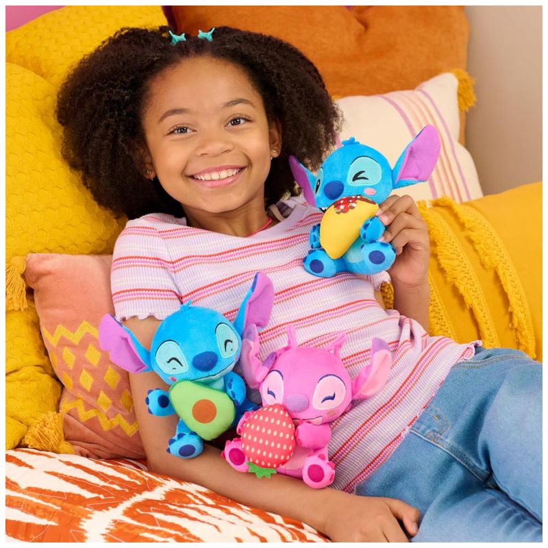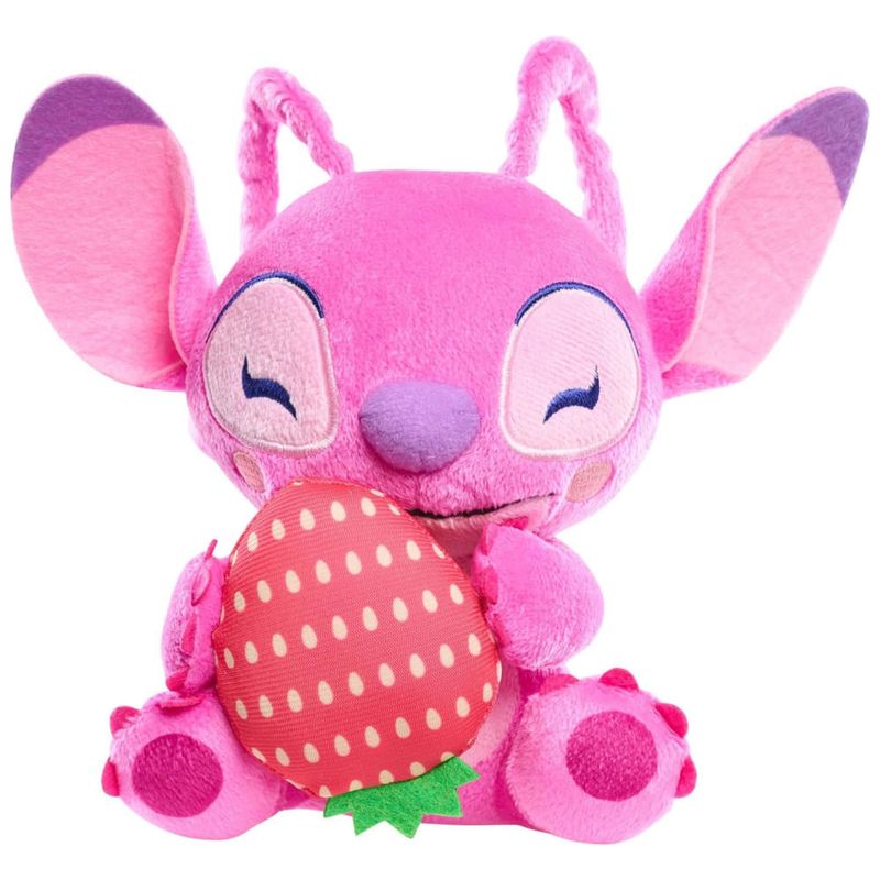 Angel está radiante ao segurar um enorme morango de pelúcia, completo com um padrão de semente impresso, adicionando um toque de diversão e fantasia ao brinquedo. Este extraterrestre rosa é extraespecial e certamente trará grandes sorrisos, abraços doces e muitas aventuras durante almoços fora, noites de passeio em casa e visitas aos food trucks favoritos.