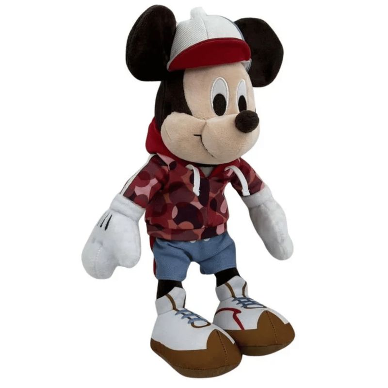 O Pelúcia Disney Mickey de Moletom 30cm: O Mickey mais descolado chegou! Vestido com moletom estampado, bermuda jeans, tênis estilosos e boné virado para o lado, essa pelúcia une o clássico da Disney a um visual urbano moderno.