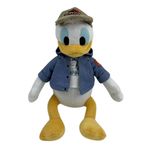 Donald vestido com boné, jaqueta e camiseta estampada: Um visual moderno e exclusivo que agrada a todos os fãs, tornando a pelúcia um item de destaque em qualquer coleção.