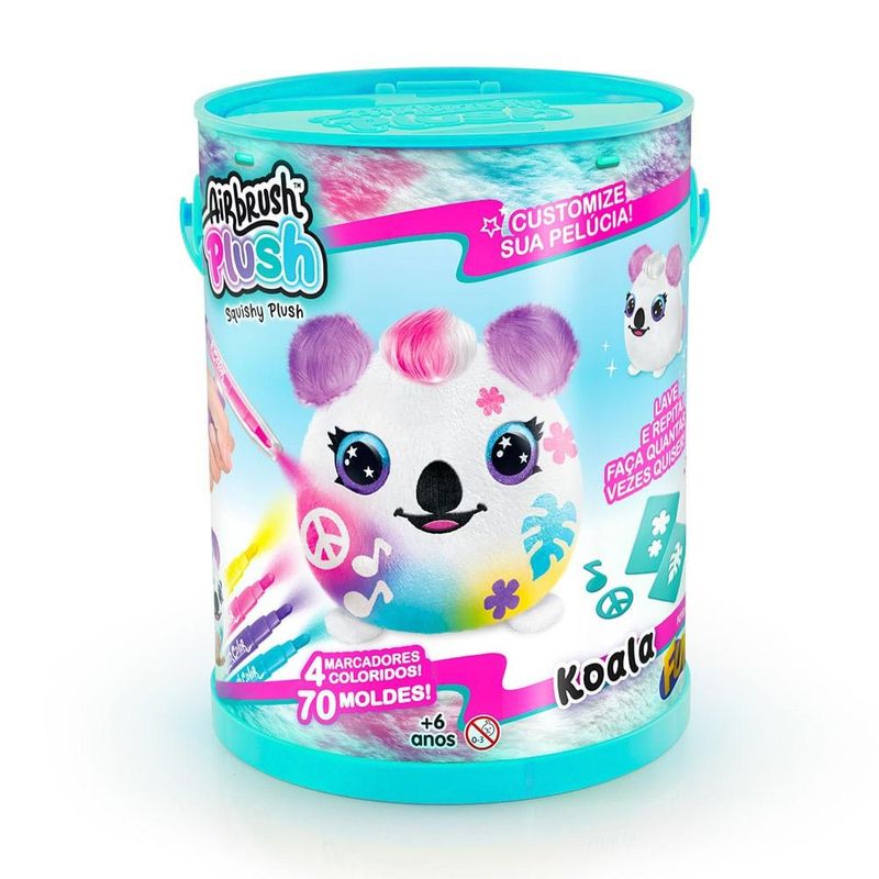 Pelúcia para Pintar Airbrush na Lata Koala- Fun Divirta-se Fun Airbrush Pelúcia na Lata. Seu animal de estimação fofinho chegou para alegrar ainda mais sua diversão. Macio e sedoso você pode estilizar como sua imaginação mandar. O kit contém 2 seringas aerógrafas para colorir, sticks para molde de pintura e 4 canetas para colorir. Selo Inmetro: 007589/2022