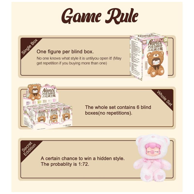 A pelúcia ROBOTIME Nanci Blind Box Colorful Chocolate Bear é um item colecionável em edição aleatória, com seis cores diferentes e uma edição secreta rara (rosa), produzida em poliéster de alta qualidade. Cada caixa contém uma pelúcia de urso macio e um cartão de personagem. Altura aproximada de 17,5 a 18 cm, ideal para decoração, presente ou coleção de fãs de anime e cultura kawaii. Produto indicado para maiores de 14 anos, cores enviadas de forma aleatória sem escolha prévia. Não requer montagem ou pilhas.