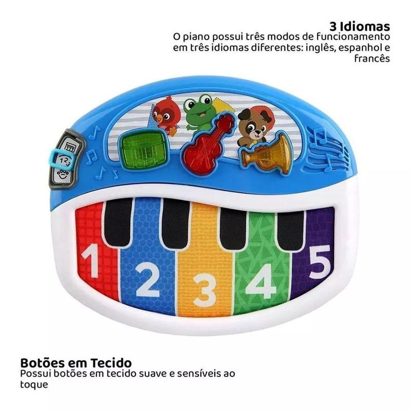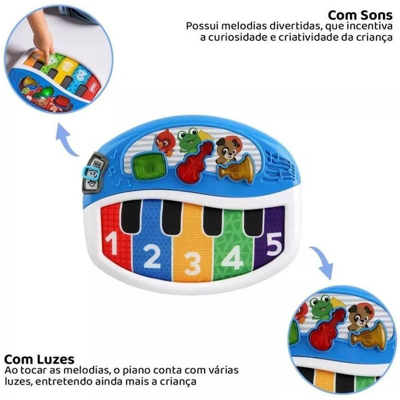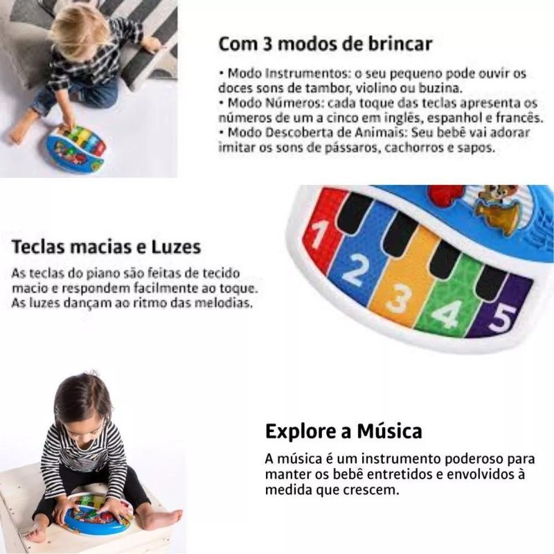 PIANO BABY EINSTEN DISCOVER E PLAY As teclas de piano de tecido macio respondem facilmente ao toque, ótimo para brincar em casa ou nos passeios, controle de volume alimentado por baterias, esse produto requer 3 pilha do tipo AA, que ja estão inclusas. Características Principais: Composição: Plástico e tecido. Dimensões: 22,9 x 28,4 x 5,7cm Garantia contra defeitos de fabricação