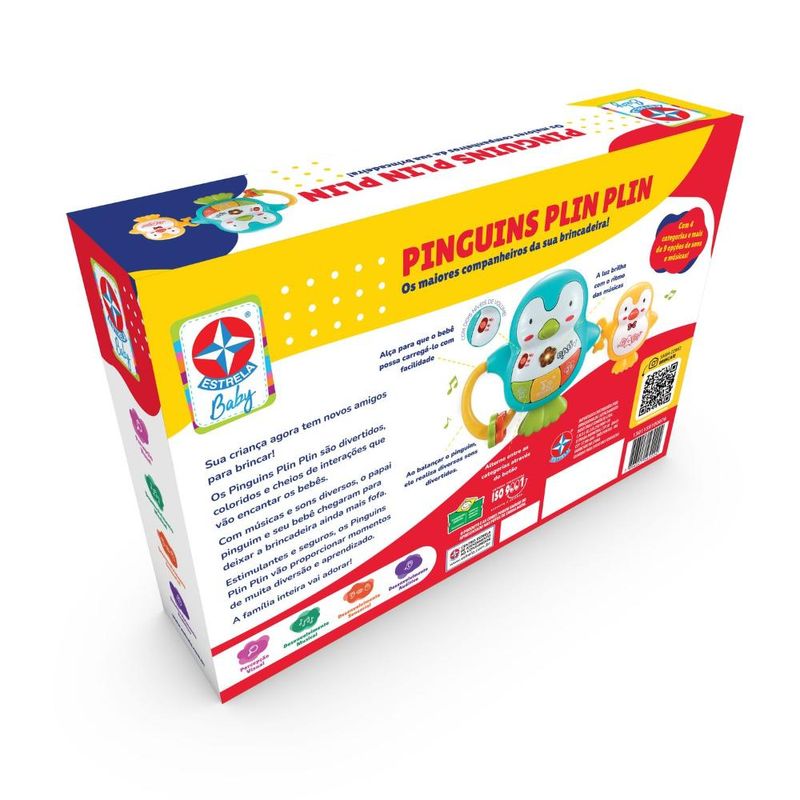 Ficha Técnica:Marca: Estrela;Nome do produto: Pinguins Plin Plin Atividades;Idade recomendada: A partir de 18 meses;Selo Inmetro: Em certificação;Contém: 1 brinquedo.