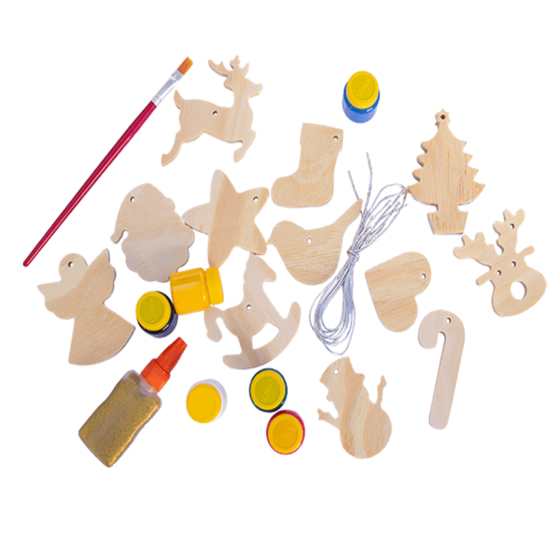 Conjunto no tema Natal. São 12 peças em madeira de reflorestamento, 12 cordões para pendurar os enfeites, 6 cores de tinta atóxica e pincel para colorir. Além de pintar os personagens e objetos, poderá utilizar as peças como enfeites natalinos para uma linda árvore de natal!  O que inclui: 12 peças em madeira de reflorestamento na temática Natal - 12 cordões para pendurar os enfeites - Pincel - Seis cores de tinta guache atóxica