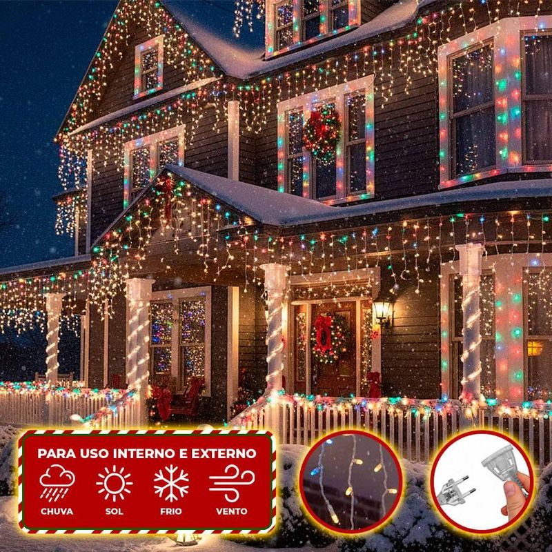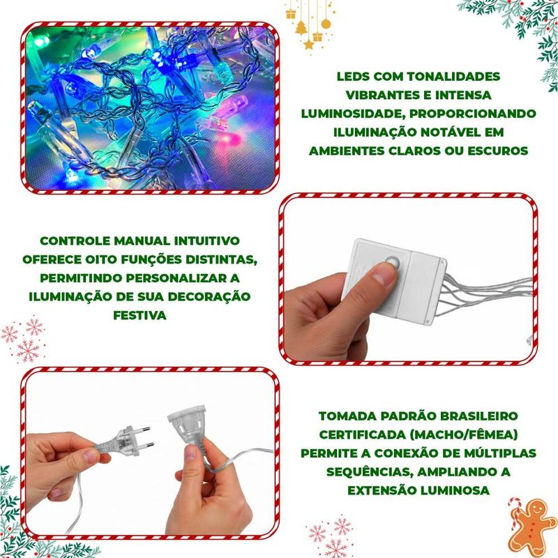 Crie uma atmosfera natalina linda e mágica com o Pisca Pisca Cascata de 400 LEDs coloridos. Com um comprimento total de 6 metros de fio principal e quedas de aproximadamente 55 cm, este enfeite é ideal para fachadas, grandes janelas e varandas, garantindo um visual de grande impacto e alta cobertura. As 400 lâmpadas LED oferecem tonalidades vibrantes e intensa luminosidade, garantindo uma iluminação notável em ambientes claros ou escuros. Seu design em formato cascata proporciona um efeito visual encantador e uniforme. O produto conta com um controle manual intuitivo que oferece 8 padrões de iluminação distintos para personalizar sua decoração festiva. Além disso, possui tomada padrão brasileiro certificada (macho/fêmea), permitindo a conexão em série de múltiplas sequências para ampliar ainda mais a cobertura luminosa de sua festa de final de ano. É uma peça essencial para quem busca uma decoração natalina completa e de destaque. LEDs coloridos vibrantes e intenso brilho Com 8 padrões de iluminação Conexão macho/fêmea expansível Alto número de LEDs (400) 6 Metros À prova d'água (Uso interno e externo) OBS: A voltagem deste produto é 220V. Manter longe do alcance de crianças e animais, perigo de choque.