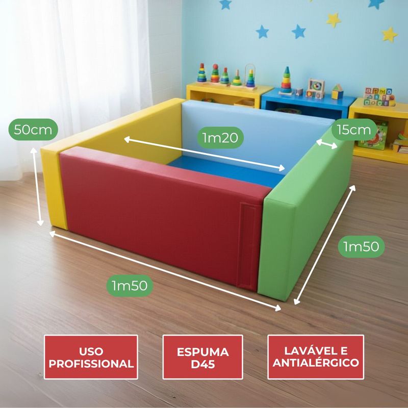 Segura, firme e divertida — ideal para escolas, clínicas e espaços educativos. A Piscina Espumada Premium Pro D45 da Brinquedos Mil foi desenvolvida para unir diversão, resistência e funcionalidade em ambientes que exigem mais do produto. Fabricada com espuma de alta densidade D45, oferece estrutura firme e estável para o uso profissional, suportando atividades intensas com crianças de 1 a 6 anos. Seu formato quadrado proporciona espaço amplo para brincadeiras com bolinhas, estímulo sensorial e atividades psicomotoras, sendo ideal para escolas, clínicas de fisioterapia, consultórios terapêuticos e salas de integração sensorial. Alta resistência com espuma D45 Estrutura firme, desmontável e lavável Material antialérgico, atóxico e impermeável Cores vibrantes que encantam e estimulam Dimensões: Área interna útil: 1,20m x 1,20m Área externa total: 1,50m x 1,50m Altura: 50cm (bordas com 15cm de largura) Capacidade: até 1.000 bolinhas (vendidas separadamente) Sugestões de uso: Espaços sensoriais em clínicas e escolas Atividades motoras e recreativas Inclusão em circuitos espumados profissionais Brincadeiras livres com estímulo ao equilíbrio e coordenação