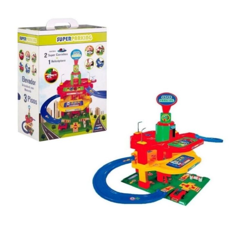 O Super Parking da Maptoy é um brinquedo interativo que permite total interação da criança. Ele simula praticas cotidianas de um grande estacionamento, permitindo transitar entre as pistas com o carrinho, estacionar, abastecer nas bombas de gasolina, subir e descer com o automovel em um grande elevador, e muitas outras funções muito divertidas. E para a brincadeira ficar ainda mais completa, vem com dois super carrinhos e um helicóptero.