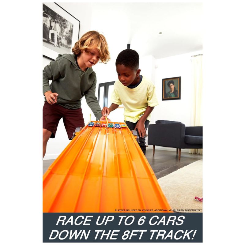 Prepare se para uma experiência emocionante com o Hot Wheels Super 6Lane Raceway Com mais de 2,43 metros de pista, as crianças podem enviar seus carros favoritos pela distância e descobrir qual é o mais rápido. O conjunto inclui seis veículos Hot Wheels para que a competição comece imediatamente. Luzes e sons realistas adicionam emoção à corrida. O conjunto é compatível com a maioria dos veículos Hot Wheels, exceto alguns modelos. As cores e decorações do conjunto podem variar. O Hot Wheels Super 6Lane Raceway é fácil de montar e desmontar, tornando o ideal para armazenamento e configuração rápida. É um presente emocionante para fãs de corridas de todas as idades.