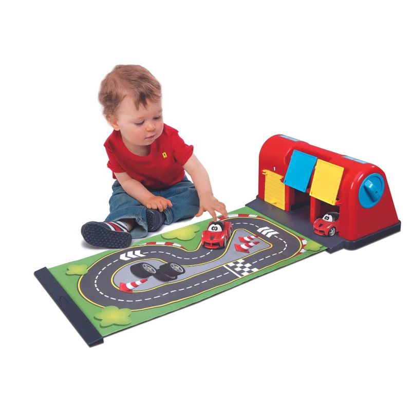 O Roll-Away Raceway é um tapete de jogo, que pode ser facilmente enrolado e desenrolado, além de disponibilizar 3 opções de estacionamento coloridos. O conjunto de brinquedos tem três portas de garagem em cores diferentes, onde a Ferrari pode ser facilmente estacionada.