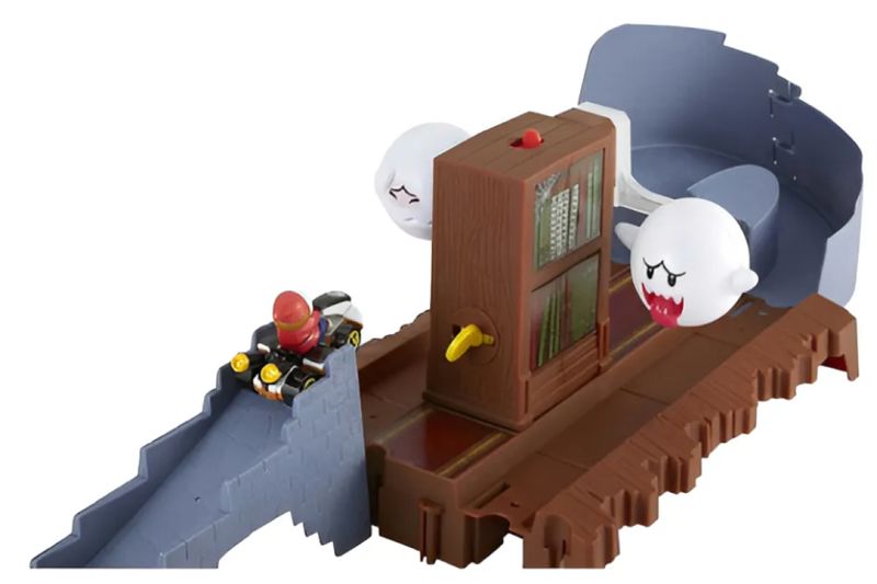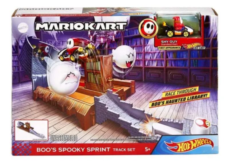 Hot Wheels Mario Kart - Conjunto da Assustadora Pista de Corrida do Boo da Mattel. Hot Wheels traz a ação rápida do mundo Mario Kart para a vida real com esse conjunto de pista inspirado em percursos icônicos do videogame aclamado pela crítica. Inclui um veículo Mario Kart repleto de réplicas que as crianças lançam para superar obstáculos e desafios como no jogo, mas desta vez na pista de Hot Wheels! Ficar na pista é a chave para ser o piloto mais rápido do percurso! Ótimas emoções de dublês e corridas para crianças pequenas que amam Mario Kart!