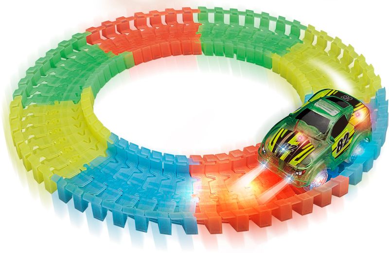 encaixe. Molde. Incline. Potencialize a Brincadeira! a Pista Brilha No Escuro! Carrinho com Luzes! Acompanha Cartela de Adesivos Para Personalizar o Carrinho!