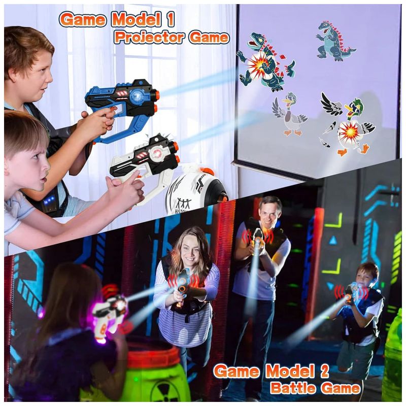 Kit mais inovador: Nosso conjunto de pistola de lazer com projetor infravermelho contém uma etiqueta de lazer azul, uma pistola de laser branca e um projetor de sensor branco. Com nosso conjunto profissional de s de lazer, você terá uma variedade de modos de jogo. Em primeiro lugar, você pode usar um projetor para jogos de projeção. Além disso, você pode usar nossas s de brinquedo sozinho para participar de jogos ao ar livre para crianças. Os jogos de projeção proporcionarão uma experiência de jogo diferente.