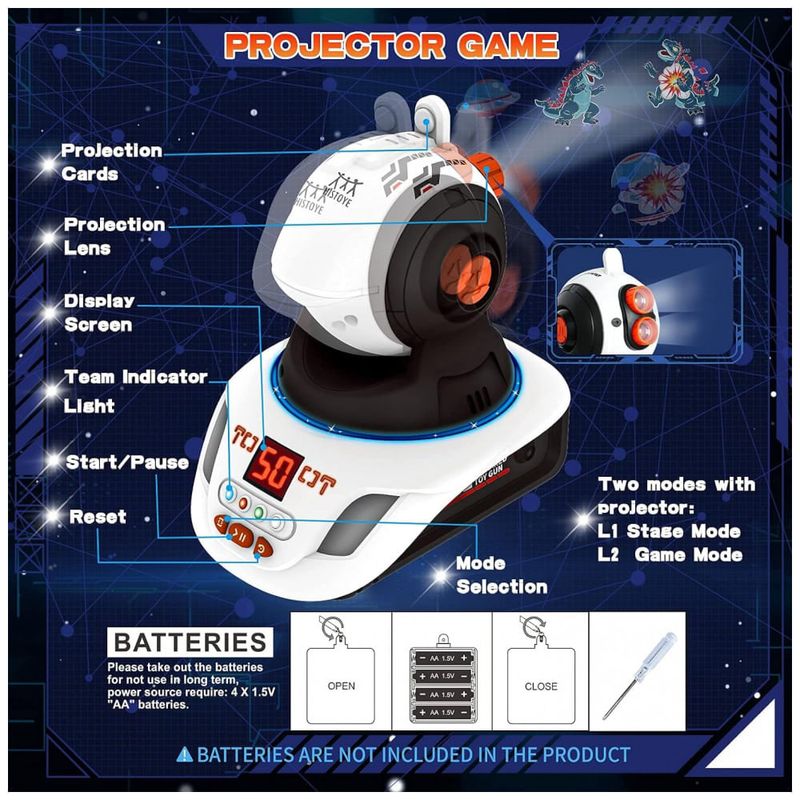 Modos Multi Play: O conjunto de laser tag tem dois modos com projetor, basta apontar o projetor em qualquer parede interna, haverá padrões claros, então aponte as s rapidamente para os padrões e atire neles, quando você acertar um padrão com sucesso, ele explodirá e cairá e você receberá a pontuação, quem obtiver mais pontuação é o vencedor. Além disso, existem jogos ao ar livre, apenas com s de laser tag, selecione o time que deseja jogar e depois atire. vamos começar o jogo lazer tag
