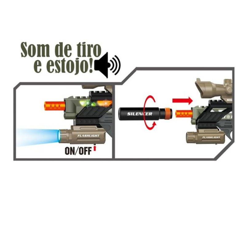 Emite som, luzes e possui Mira Telescópica, quando você aperta o gatilho a arma produz um som de disparo e carregamento.