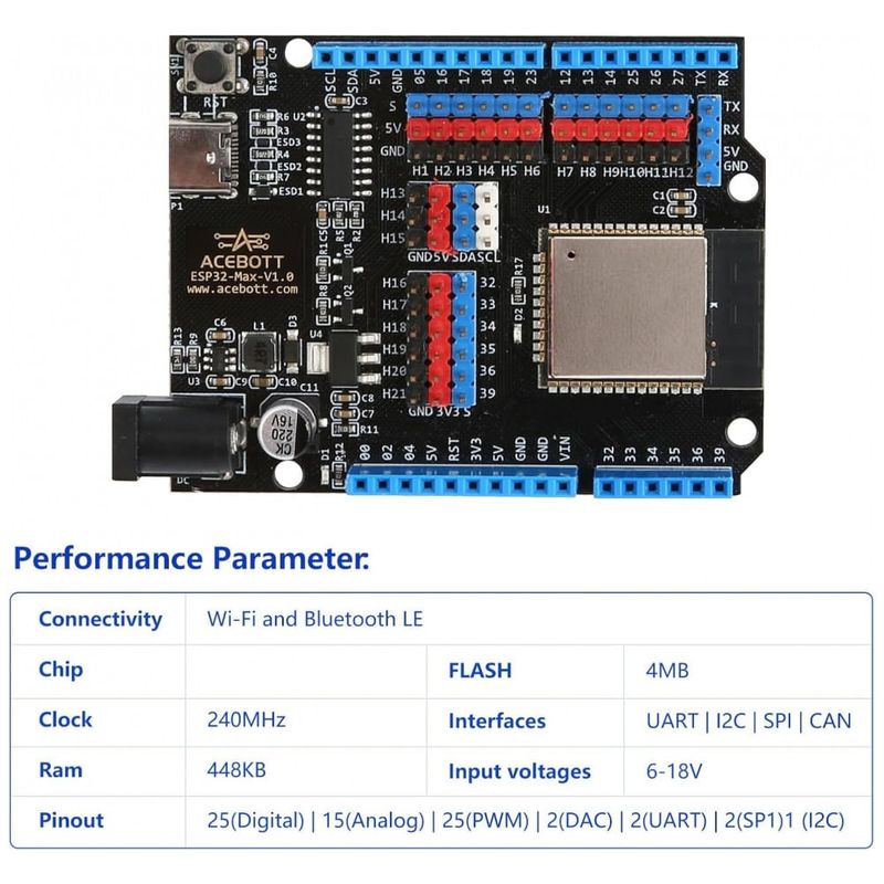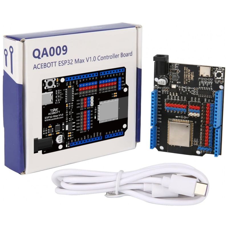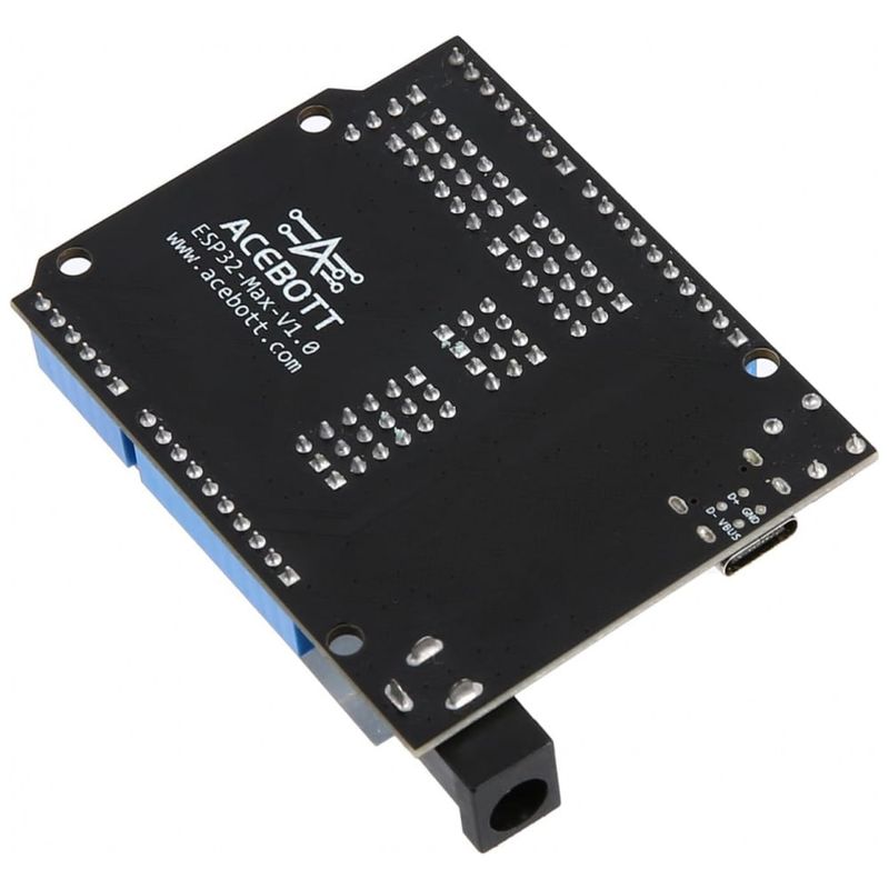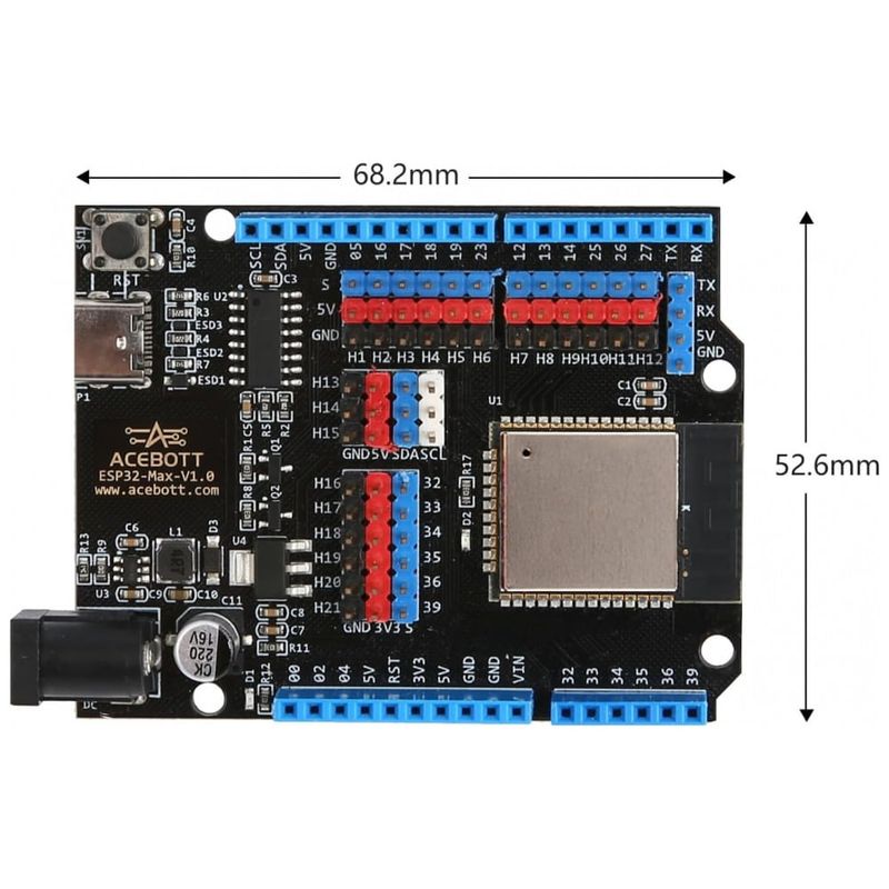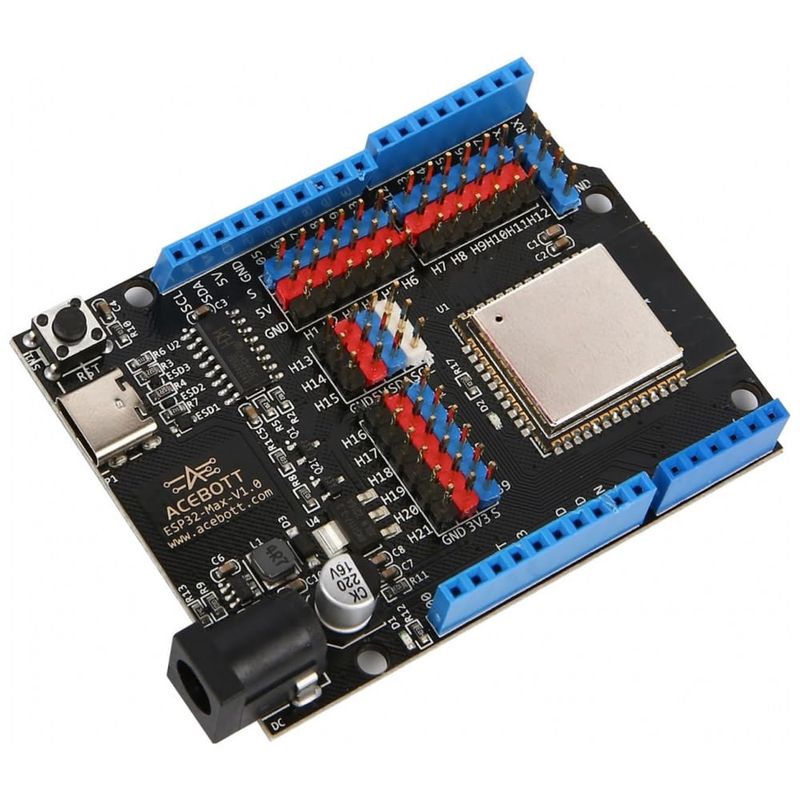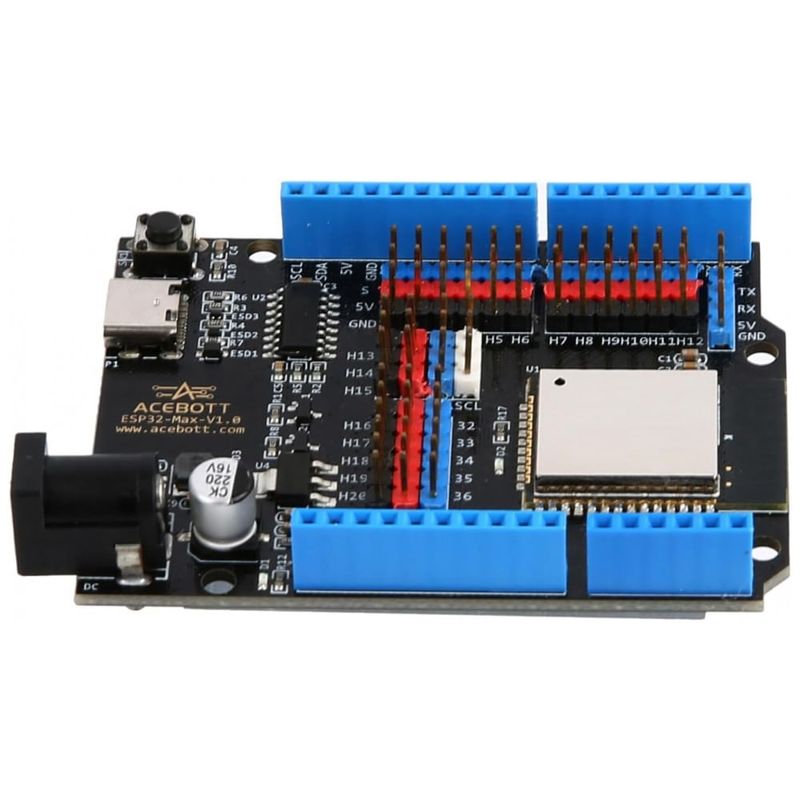 A ACEBOTT ESP32 Development Board Max V1.0 QA007 é uma placa educativa de desenvolvimento equipada com módulo ESP32 de 240 MHz, 4 MB de armazenamento e 448 KB de RAM, projetada para projetos de IoT, casa inteligente, robótica e mini PCs. A placa integra Wi-Fi 2,4 GHz e Bluetooth em modo dual, é compatível com Arduino IDE, Arduino Cloud e MicroPython, e expõe todos os pinos de entrada e saída (IO), dispensando o uso de protoboard em muitos protótipos. A interface USB-C possui proteção contra descargas eletrostáticas e surtos por meio de diodos de proteção, e o suporte a FreeRTOS torna a placa adequada para aplicações de tempo real, como robôs, consoles de jogos simples e sistemas de automação.