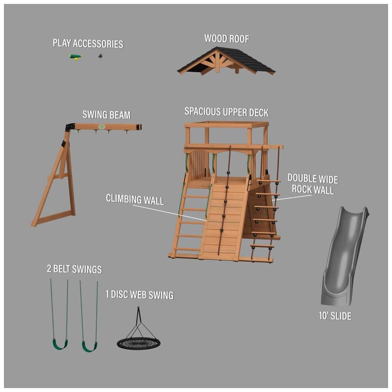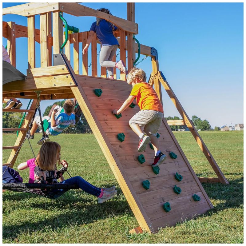 O balanço de disco de 1 metro (40 polegadas) e os dois balanços de cinto com correntes revestidas garantem diversão contínua e segura para as crianças. O Double Wide Rock Wall de 1,52 metros de altura é ideal para dois escaladores, tornando a brincadeira ainda mais social e emocionante.