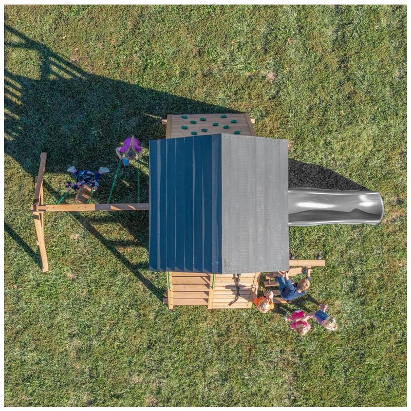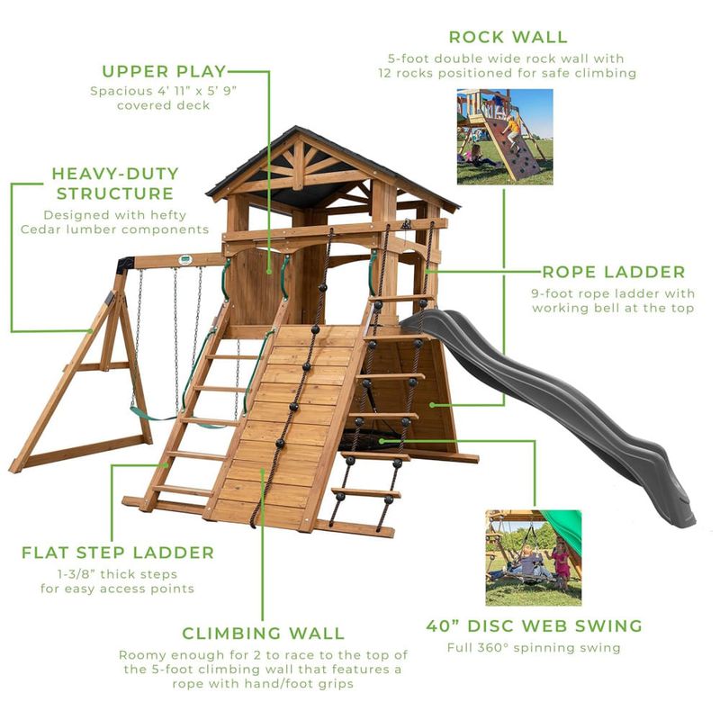 Com um deck coberto estilo casa na árvore de 1,52 metros x 1,75 metros, as crianças poderão explorar alturas, se envolver em brincadeiras imaginativas e até se esconder no alto. A parede de escalada de 1,5 metros de altura ajuda no desenvolvimento do equilíbrio e das habilidades motoras, enquanto as cordas com apoios para as mãos e pés tornam a escalada ainda mais divertida e desafiadora.