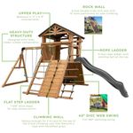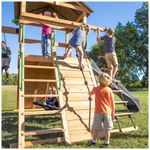 O escorregador de ondas de 3 metros (10 pés) com grades laterais altas proporciona uma descida rápida e segura, e a escada de corda de 2,75 metros oferece mais uma atividade divertida para melhorar a coordenação e a força, com o bônus de um sino funcional no topo.