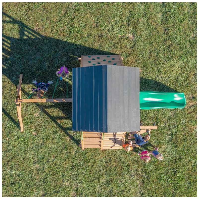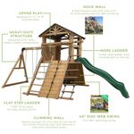 Com um deck coberto estilo casa na árvore de 1,52 metros x 1,75 metros, as crianças poderão explorar alturas, se envolver em brincadeiras imaginativas e até se esconder no alto. A parede de escalada de 1,5 metros de altura ajuda no desenvolvimento do equilíbrio e das habilidades motoras, enquanto as cordas com apoios para as mãos e pés tornam a escalada ainda mais divertida e desafiadora.