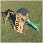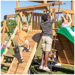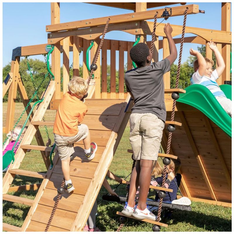O escorregador de ondas de 3 metros (10 pés) com grades laterais altas proporciona uma descida rápida e segura, e a escada de corda de 2,75 metros oferece mais uma atividade divertida para melhorar a coordenação e a força, com o bônus de um sino funcional no topo.