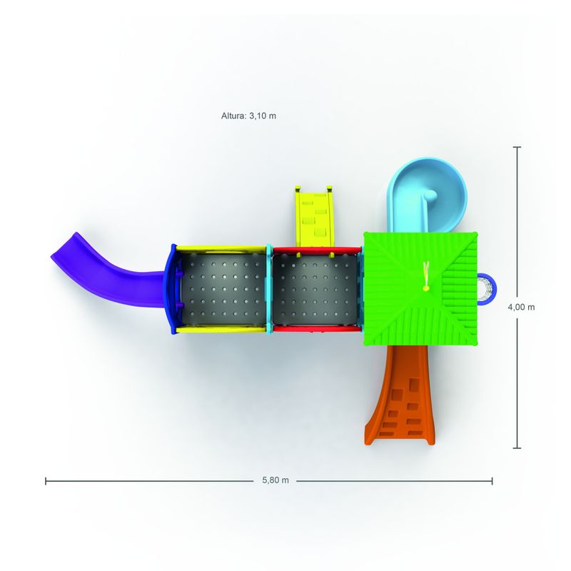 Módulos com nível superior e inferior em formato quadrado, composta por 10 paredes: 4 paredes grandes azuis, 4 paredes grandes amarelas, 2 paredes médias vermelhas, 1 telhado, 1 escorregador em curva, 1 escorregadores em onda, 1 escorregador pequeno que vira escalador, 1 escalador, 9 cubos do jogo da velha e 1 tabela de basquete com bola. Cobertura com telhado quadrado. Aberturas nas paredes em formato circular para instalação de componentes como escorregadores, escaladas, etc. Playground Modular com possibilidade de expansão ilimitada, podendo ser acoplado a qualquer produto da linha de playgrounds XALINGO. Ideal para locais abertos. A montagem da lateral é feita por encaixe. Produto com certificação INMETRO.