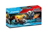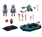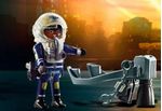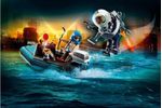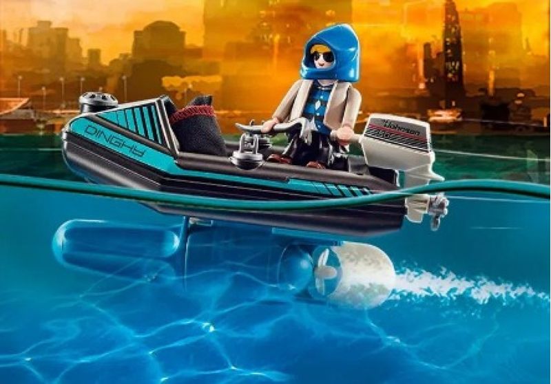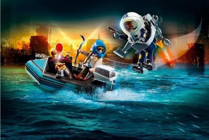 Playmobil City Action - Polícia Com Jetpack e Barco 70782 Alarme na cidade. Alguém entrou no museu. O suspeito foge num barco. Escondeu o roubo num saco-cama. Embora o ladrão se mova rapidamente de barco, um polícia astuto da PLAYMOBIL já está a seguir o seu rasto com o seu jetpack. O agente aproxima-se rapidamente do barco e salta a bordo. Alguns minutos depois, as algemas clicam. Felizmente, os valiosos objetos de arte estão ilesos e podem ser devolvidos ao museu. O set contém duas figuras da PLAYMOBIL, um barco inflável, uma mochila propulsora, um saco-cama, objetos de arte e muitos outros extras. O barco pode flutuar e ser atualizado com o motor subaquático.