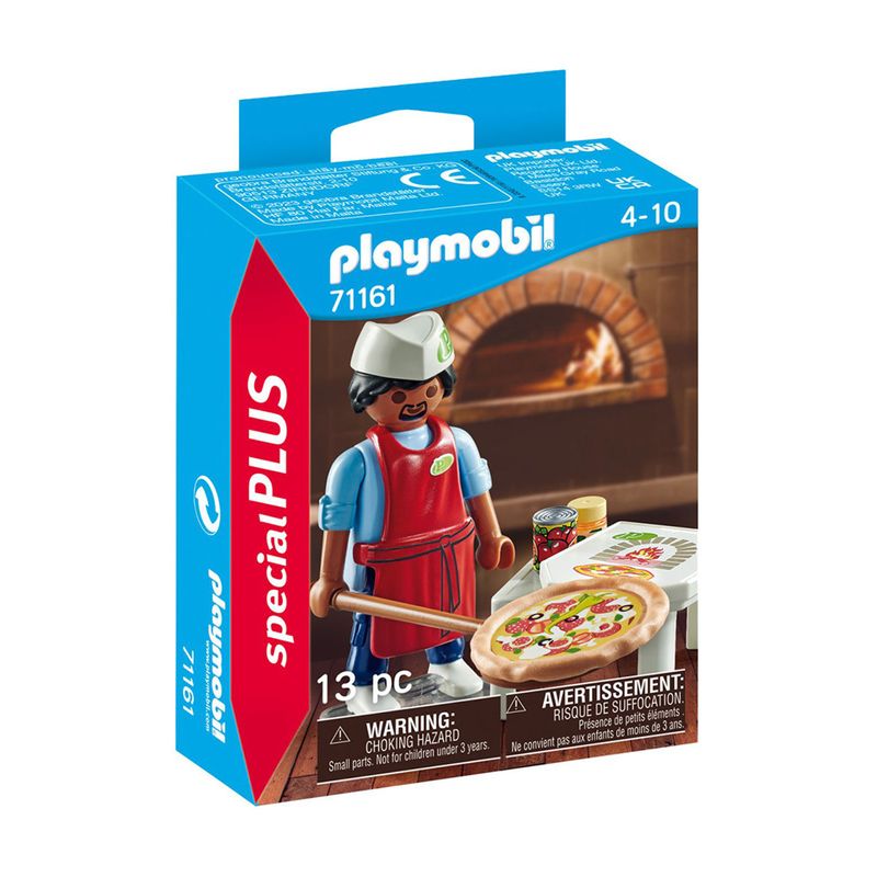 - O Special Plus Set inclui uma figura Playmobil com um chapéu de chef, uma mesa, tomates enlatados, uma caixa de pizza, uma placa de suporte para maior estabilidade da figura e outros extras.
