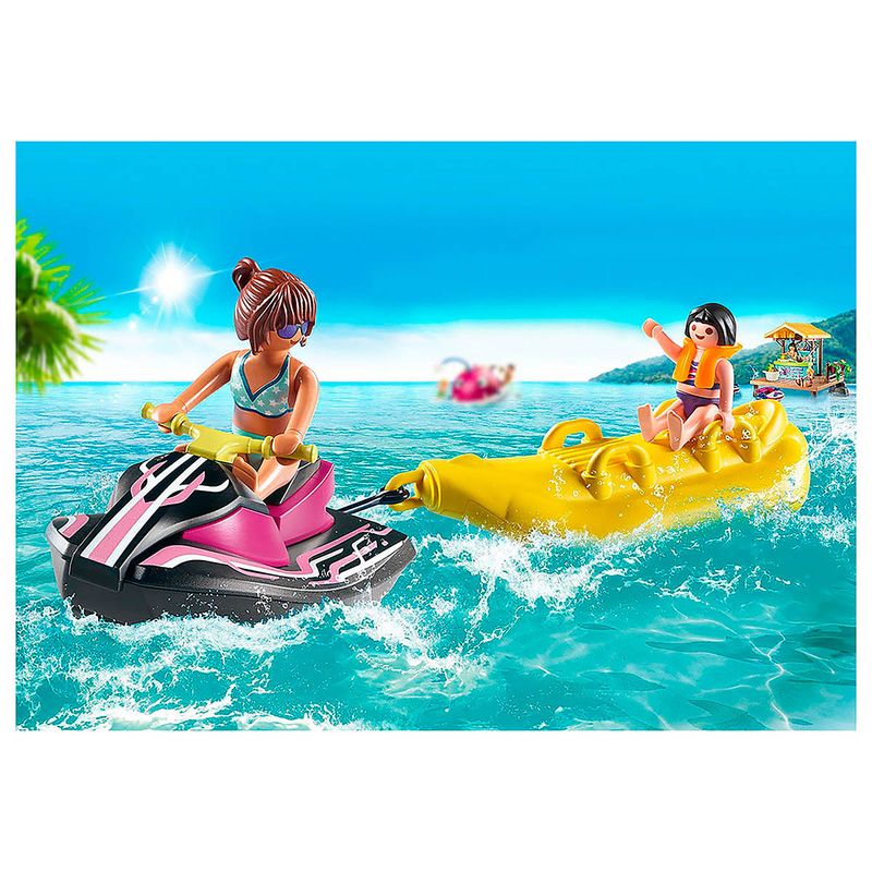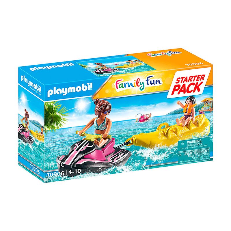 Embarca nos passeios aquáticos selvagens com a moto de água e barco banana da PLAYMOBIL. A menina senta-se animadamente no barco banana e a mulher na moto de água que a leva através das ondas. Graças ao colete salva-vidas, a menina fica bem protegida caso caia na água. Este Starter Pack Moto de Água com Barco Banana é uma ótima introdução ao mundo lúdico e divertido da PLAYMOBIL, onde meninos e meninas podem reviver as suas memórias de férias favoritas.