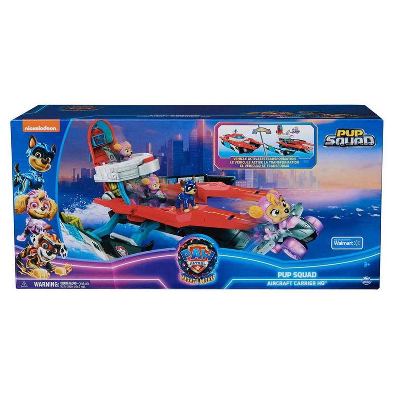 PORTA-AVIÕES SE TRANSFORMA EM QG. Esse porta-aviões se transforma em um QG, perfeito para missões de resgate em alto mar! FIGURA MIGHTY INCLUSA. Acompanha um filhote da Patrulha Canina versão Mighty Movie! A Skye. REVELE O CENTRO DE CONTROLE. Levante o teto do centro de comando e coloque o carro de corrida da Skye para elevar e revelar a sala de controle e a rampa de lançamento por gravidade. DIVERSOS AMBIENTES PARA EXPLORAR. O QG Porta-Aviões possui quarto de dormir, um seletor de controle de missão, laboratório de meteoros e até mesmo uma cela de prisão, para salvar o dia em inúmeras aventuras! EXPLORE A CRIATIVIDADE. Com os brinquedos da Patrulha Canina, a criança pode explorar sua imaginação e desenvolver habilidades motoras por meio de brincadeiras enquanto revive suas cenas favoritas do filme!