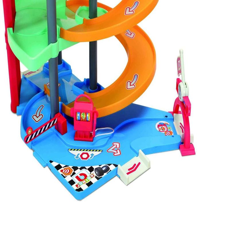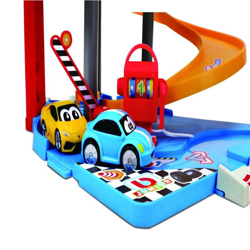 Acompanhe os sonhos do seu filho. Corra com o BB Junior com os veículos descendo as pistas circulares de faixa dupla ou descendo estrada em espiral.