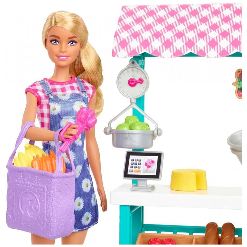 Inclui boneca Barbie loira, banca de , caixa registradora, frutas, legumes, queijo, pão, flores e sacola de compras