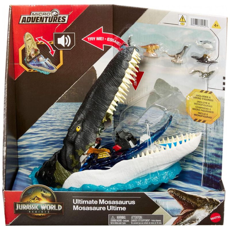 Conteúdo da embalagem: 1 playset Mosasaurus com som e partes móveis e 6 micro figuras?