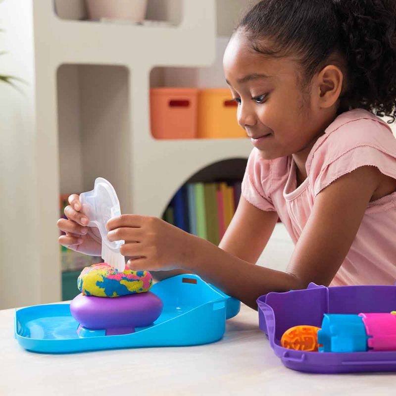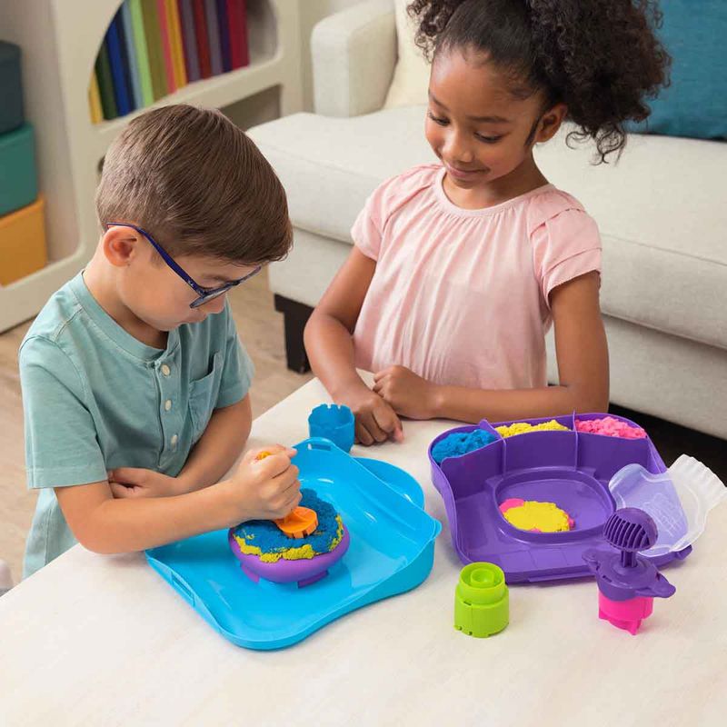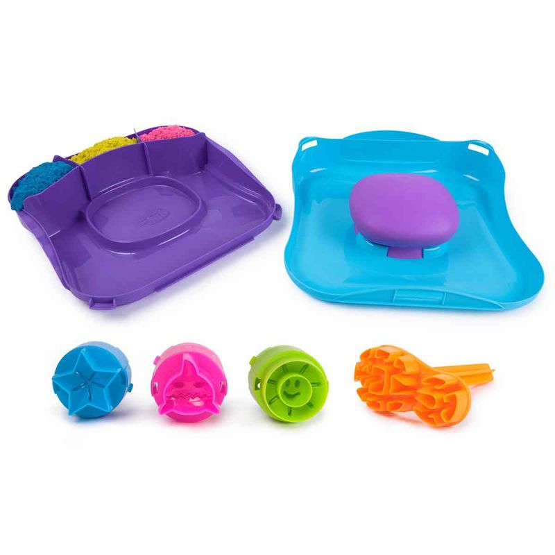 Dê vida à criatividade e ao movimento com o conjunto Kinetic Sand SquishMotion! Este kit de areia cinética despertará a imaginação e a emoção enquanto as crianças se espremem para revelar suas hipnotizantes criações de areia em um espaço de jogo em movimento! SquishMotion é tão fácil quanto colocar, carregar e esmagar. Camada de areia cinética rosa, amarela e azul dentro da caixa, alise com o cortador de rugas e carregue o tubarão, o sol ou a estrela em sua ferramenta de carimbo. Pressione e esmague no espaço de espuma de areia e observe o movimento de suas criações – o tubarão mastiga, o sol floresce e a estrela explode! Flua, misture e coloque camadas diretamente no espaço de esmagamento, corte com o cortador de rugas e use o carimbo de sapato para uma brincadeira mais interminável. As squishibilidades são infinitas! A única areia cinética é feita de areia natural que adere a si mesma para facilitar a limpeza! Crie de novo e de novo – é tão gratificante que você não conseguirá largar! MOVIMENTOS COMO MÁGICA: A areia cinética ganha vida no espaço de areia de espuma mole do SquishMotion! Com 3 cores de areia e 3 carimbos, as crianças podem criar tubarões mastigadores, sóis sorridentes e estrelas cadentes, criando magia em cada revelação!