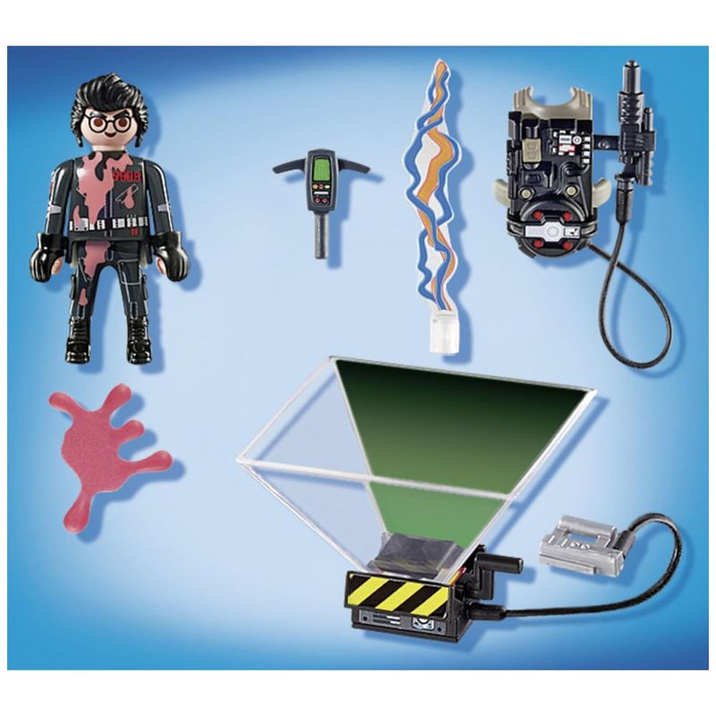 Playset temático Ghostbusters composto pela figura do personagem Egon Spengler e acessórios de captura de fantasmas, incluindo armadilha com cone holográfico transparente para simular a contenção do fantasma. A figura segue o padrão Playmobil, com articulações que permitem dobrar as pernas, sentar, ficar em pé e girar a cabeça.??