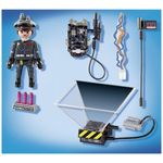 Playset temático Ghostbusters II composto pela figura de Raymond Stantz e acessórios de captura de fantasmas, incluindo armadilha com cone transparente projetado para uso com efeito holográfico via aplicativo Playmobil. A figura segue o padrão Playmobil com articulações para dobrar as pernas, sentar, ficar em pé e girar a cabeça, adequada para cenas de ação em dioramas de caçadores de fantasmas.?