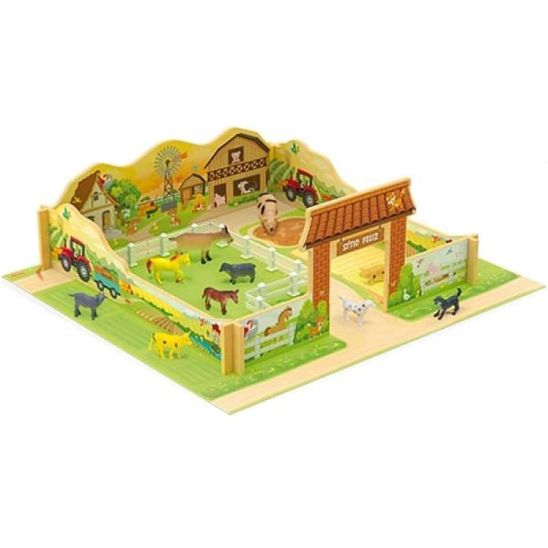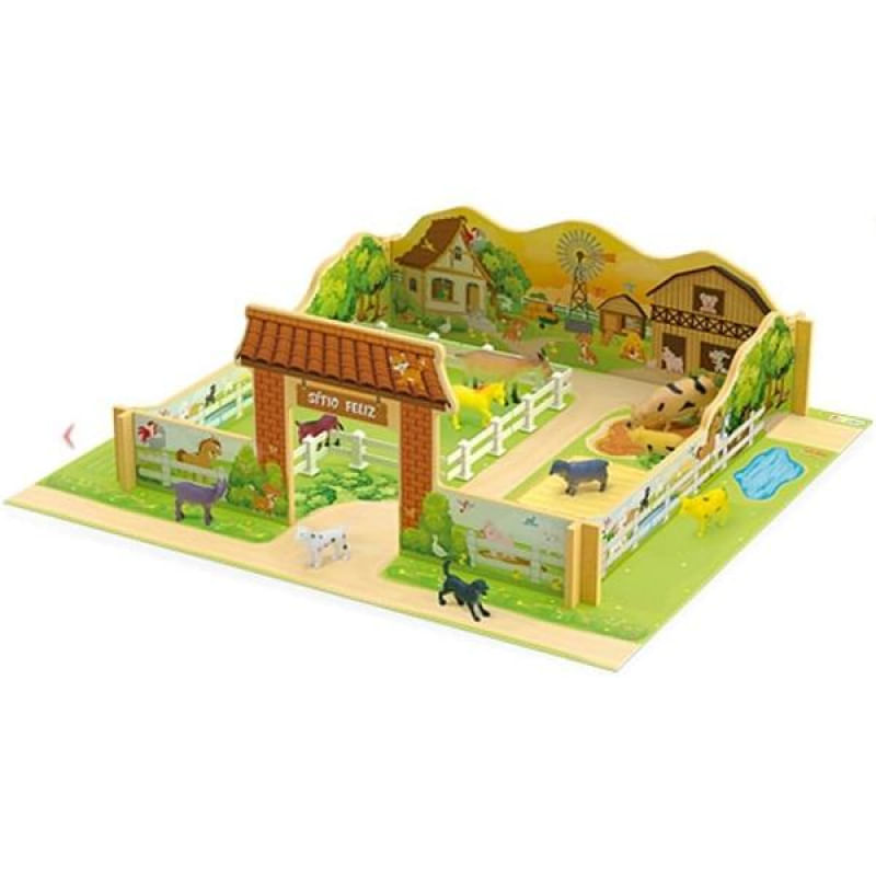 Elaborado a partir de peças em madeira de reflorestamento (MDF) ilustradas com temática de sítio, é composto por cartela base em papel cartonado 50x46cm, kit com 10 animais (sortidos) em plástico maciço e flexível, e cercas em plástico para decoração.
