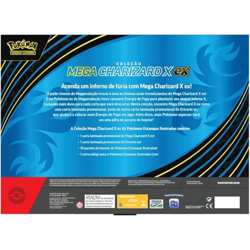 A Coleção Mega Charizard X EX é perfeita para treinadores que desejam despertar o poder supremo do Pokémon Trading Card Game. O destaque fica por conta da carta laminada promocional do poderoso Mega Charizard X EX, que domina o campo de batalha com suas chamas azuis e um ataque Inferno X devastador, que ganha força conforme cartas são descartadas e Energias de Fogo são consumidas. A coleção também inclui a carta laminada promocional de Oricorio EX, um aliado estratégico que auxilia na aceleração das Energias de Fogo no deck.