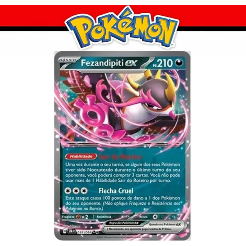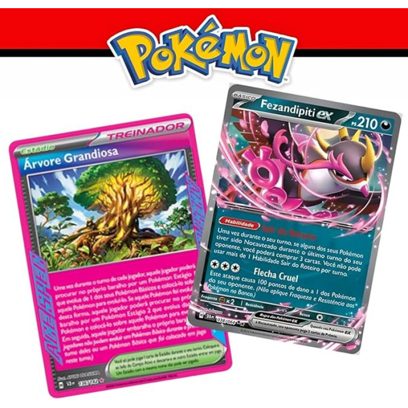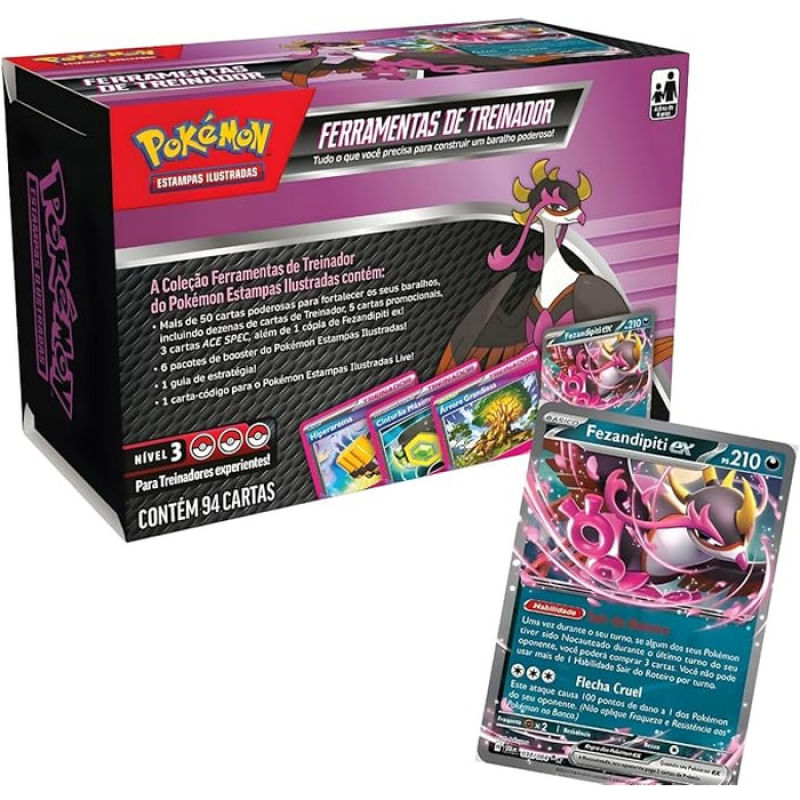 Leve sua coleção do Pokémon Estampas Ilustradas a outro nível e crie baralhos divertidos, estratégicos e competitivos! A Coleção Ferramentas de Treinador - Fezandipiti foi desenvolvida para ajudar Treinadores a aprimorar suas habilidades, oferecendo uma seleção robusta de cartas de Treinador, incluindo ACE SPEC, além de um guia de estratégia completo para orientar suas escolhas e potencializar seus melhores Pokémon.