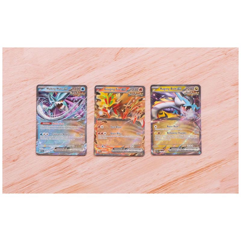 Inclui 3 cartas promocionais de destaque: Walking Wake ex, Raging Bolt ex e Gouging Fire ex, perfeitas para incrementar sua coleção ou aprimorar sua estratégia no jogo.