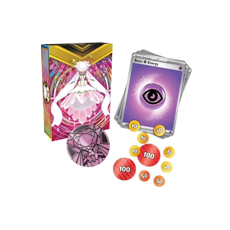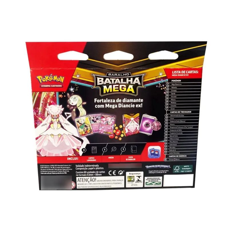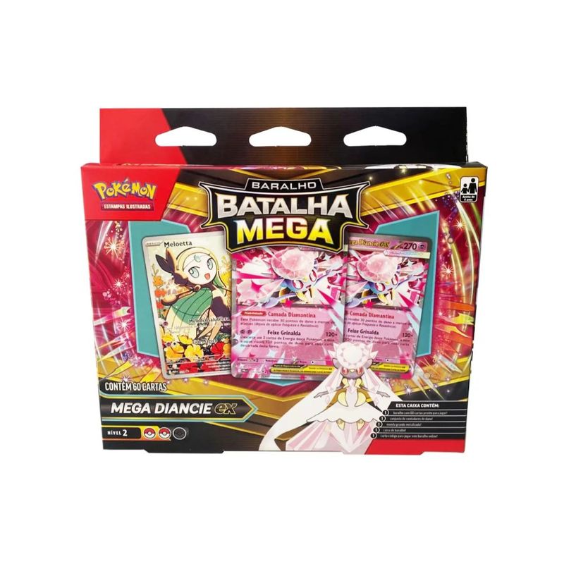 Conteúdo: 01 Baralho Batalha Mega Diancie Ex com 60 cartas 1 moeda metalizada, 1 conjunto de contadores de dano, 1 caixa para armazenar o baralho e 1 carta de código para o Pokémon TCG Live